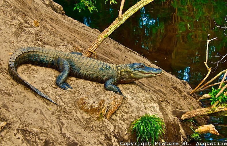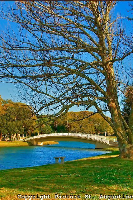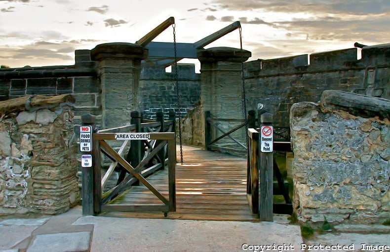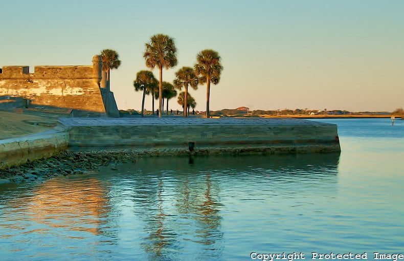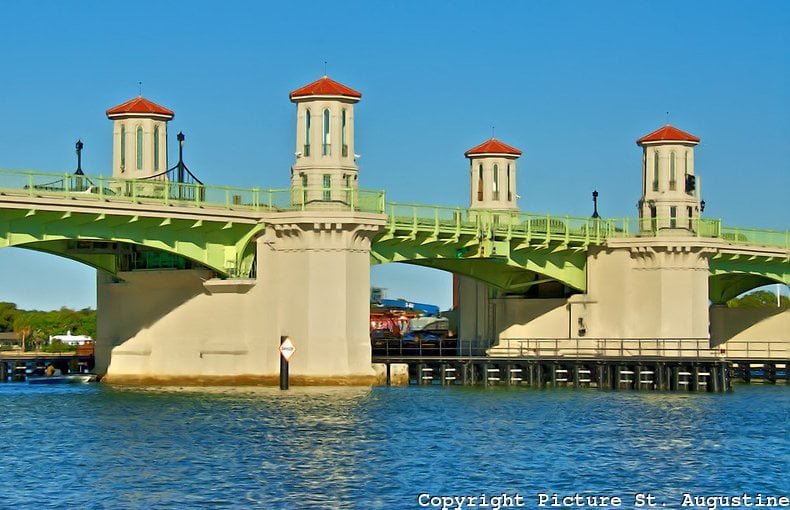 Calçadão e Fortaleza – Paralela à Saint George corre a Menedez Ave., com uma ampla calçada beirando o Rio Matanzas de um lado, e do outro restaurantes coloridos em cujos menus imperam os frutos do mar, principalmente os camarões. Ao sul, esta avenida faz limite com a bela Ponte dos Leões, que liga o centro da cidade à ilha Anastasia, onde se encontra o farol e museu de Saint Augustine e a fazenda do Jacaré (Alligator Farm)