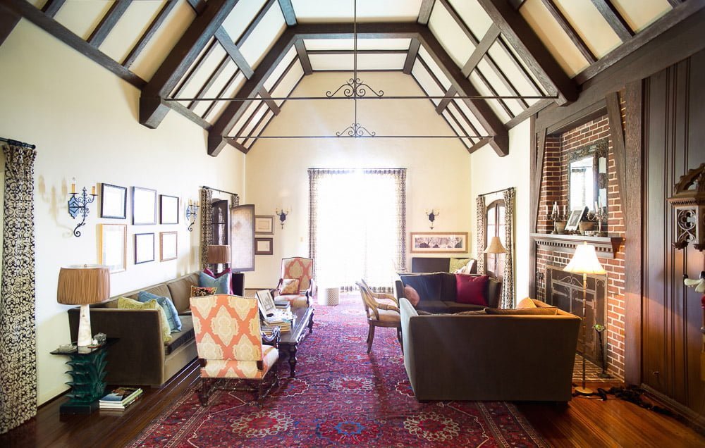 A casa conta com elementos Tudor e estilos arquitetônicos franceses da Normandia.
